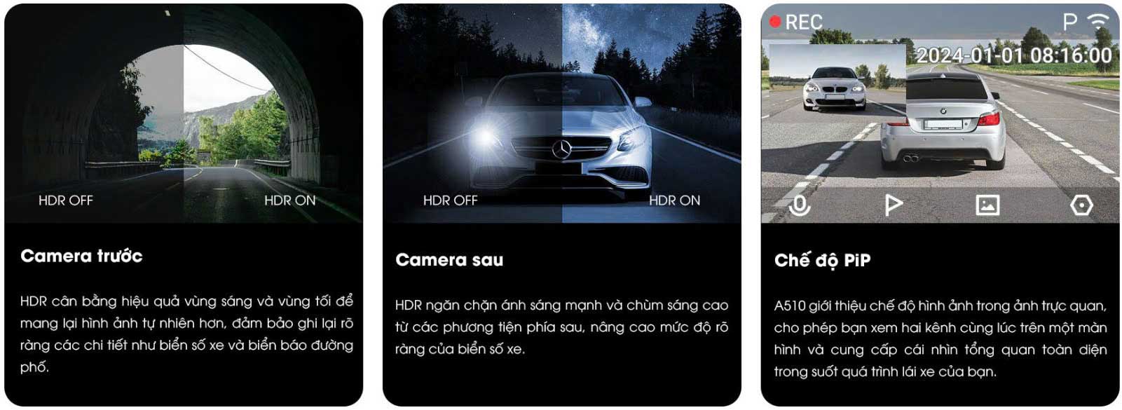 *A510 cung cấp hỗ trợ ghi hình mở rộng trên kênh thứ hai. Bạn có tùy chọn chọn RC11 để ghi phía sau 1080P, RC12 để ghi 1080P HDR hoặc camera bên trong để ghi toàn bộ cabin.