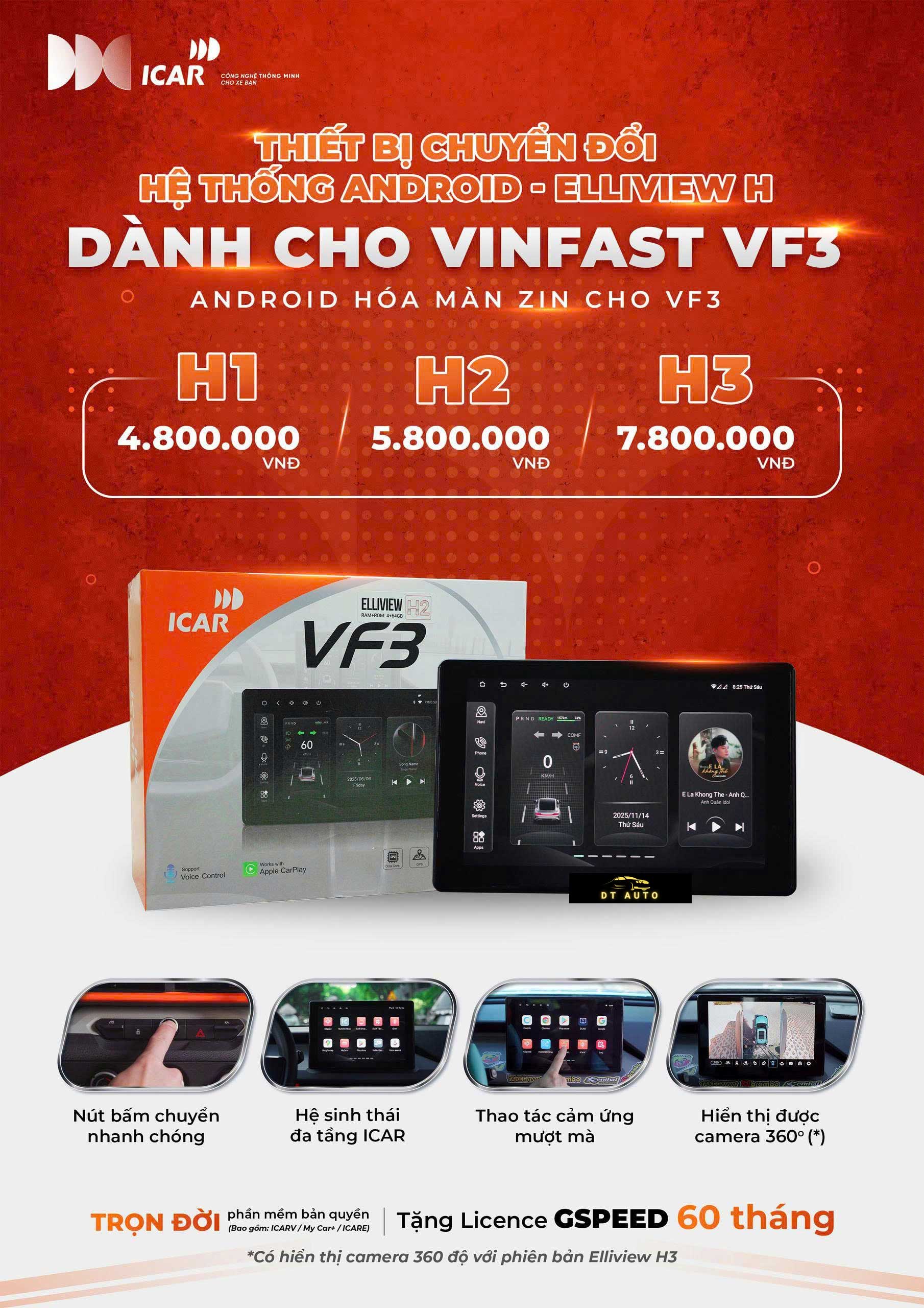 Nếu bạn đang sử dụng VinFast VF3 và mong muốn nâng cấp trải nghiệm giải trí – dẫn đường – điều khiển thông minh mà vẫn giữ nguyên thiết kế và tính nguyên bản của xe, thì Màn hình Android MHU Elliview H1 chính là giải pháp tối ưu. Với cấu hình phù hợp, hệ sinh thái ICAR tiện ích và lắp đặt tại đại lý uy tín như DTauto tại TP.HCM, bạn hoàn toàn an tâm về chất lượng, hiệu năng cũng như chế độ hậu mãi.