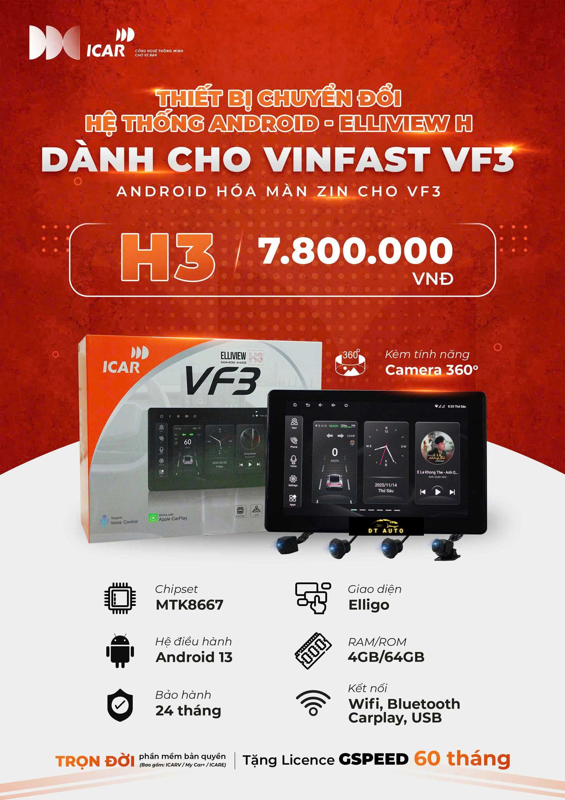 Sở hữu một chiếc VinFast VF3 – mẫu xe đô thị thông minh, bạn hoàn toàn có thể nâng cấp khoang lái lên một tầm cao mới với màn hình Android MHU Elliview H3 của ICAR. Đây là giải pháp toàn diện: kết hợp mạnh mẽ giữa giải trí – kết nối – hỗ trợ lái – quan sát toàn cảnh – giữ nguyên hệ thống zin & bảo hành của xe. Với cấu hình phần cứng hiện đại, phần mềm bản quyền trọn gói và thiết kế dành riêng cho VF3, H3 không chỉ là nâng cấp mà còn là sự đầu tư cho trải nghiệm lái & sử dụng xe hàng ngày.