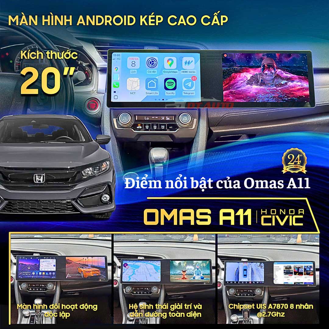 Màn hình Android Omas A11, đặc biệt dành cho dòng Honda Civic, là sản phẩm cao cấp với thiết kế màn hình đôi 20 inch (10″ + 10″), viền siêu mỏng và chất lượng hiển thị Full HD (1280×720 px). Sản phẩm nổi bật với hiệu năng mạnh mẽ và hàng loạt tính năng thông minh, giúp nâng cao trải nghiệm lái và giải trí trong xe