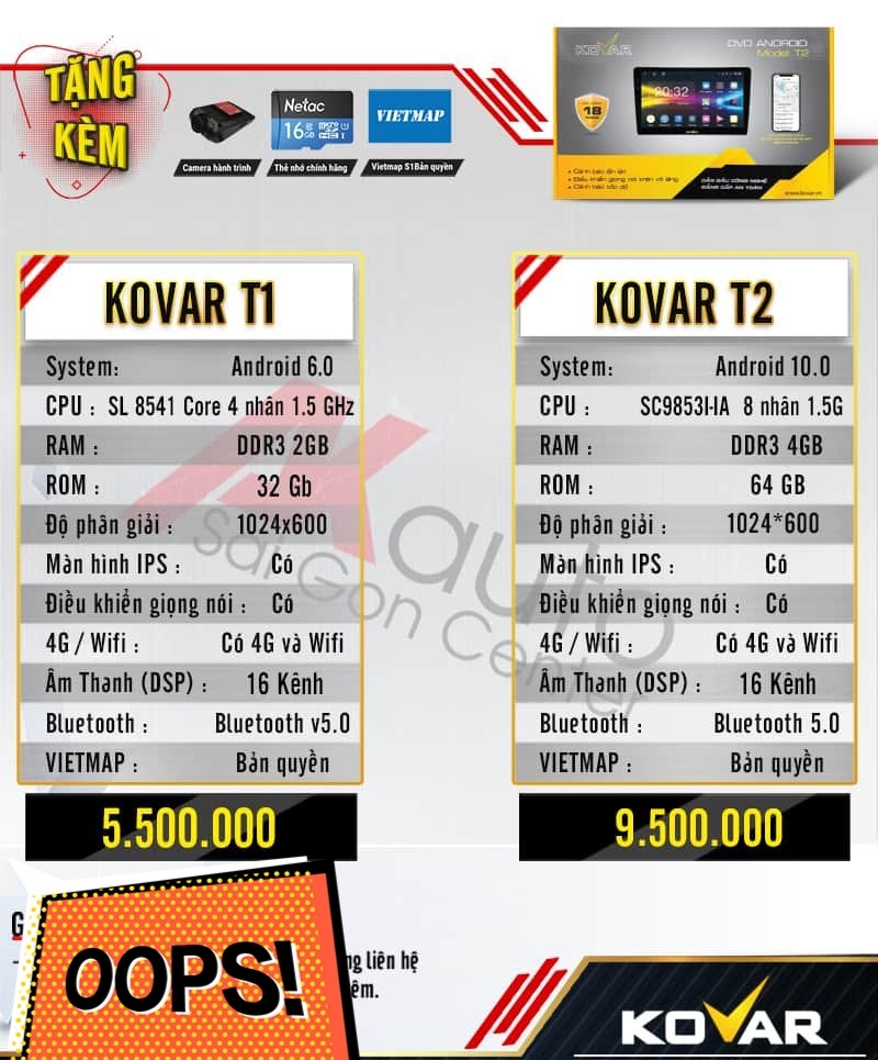 Bảng giá màn hình android ô tô Kovar - T1 & T2