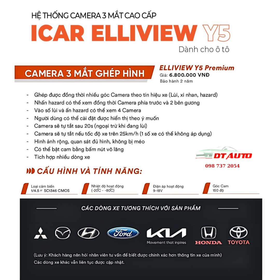Camera 3 mắt góc 150 độ Elliview Y5 Premium của ICAR tiết kiệm chi phí chỉ rẻ hơn 1/2 giá camera 360 độ mà vẫn có chức năng như 1 camera 360 quay toàn bộ xung quanh xe hơn nữa còn giữ zin tối đa các tính năng sẵn có trên xe như camera lùi hay màn zin xe.