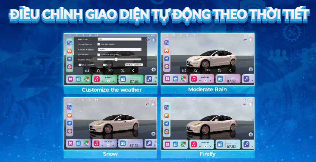 - Tự động lấy dữ liệu thời tiết và điều chỉnh giao diện phù hợp: nắng, mưa, tuyết, ban đêm… giúp người lái dễ dàng nắm bắt tình hình bên ngoài mà không cần nhìn ra ngoài xe