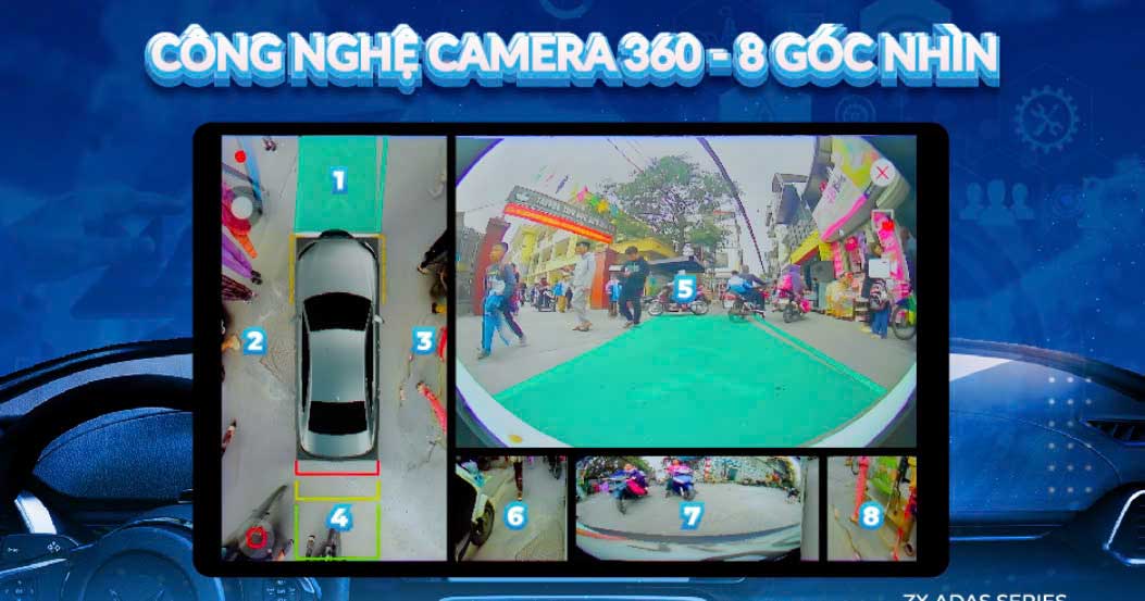 Công nghệ Camera 360 trên màn hình ZX ADAS+ tích hợp 8 góc nhìn thông minh, hiển thị đồng thời hình ảnh toàn cảnh quanh xe theo thời gian thực. Ứng dụng AI xử lý hình ảnh tiên tiến, giúp ghép nối khung hình mượt mà, giảm méo hình và tăng độ chính xác đến từng centimet.